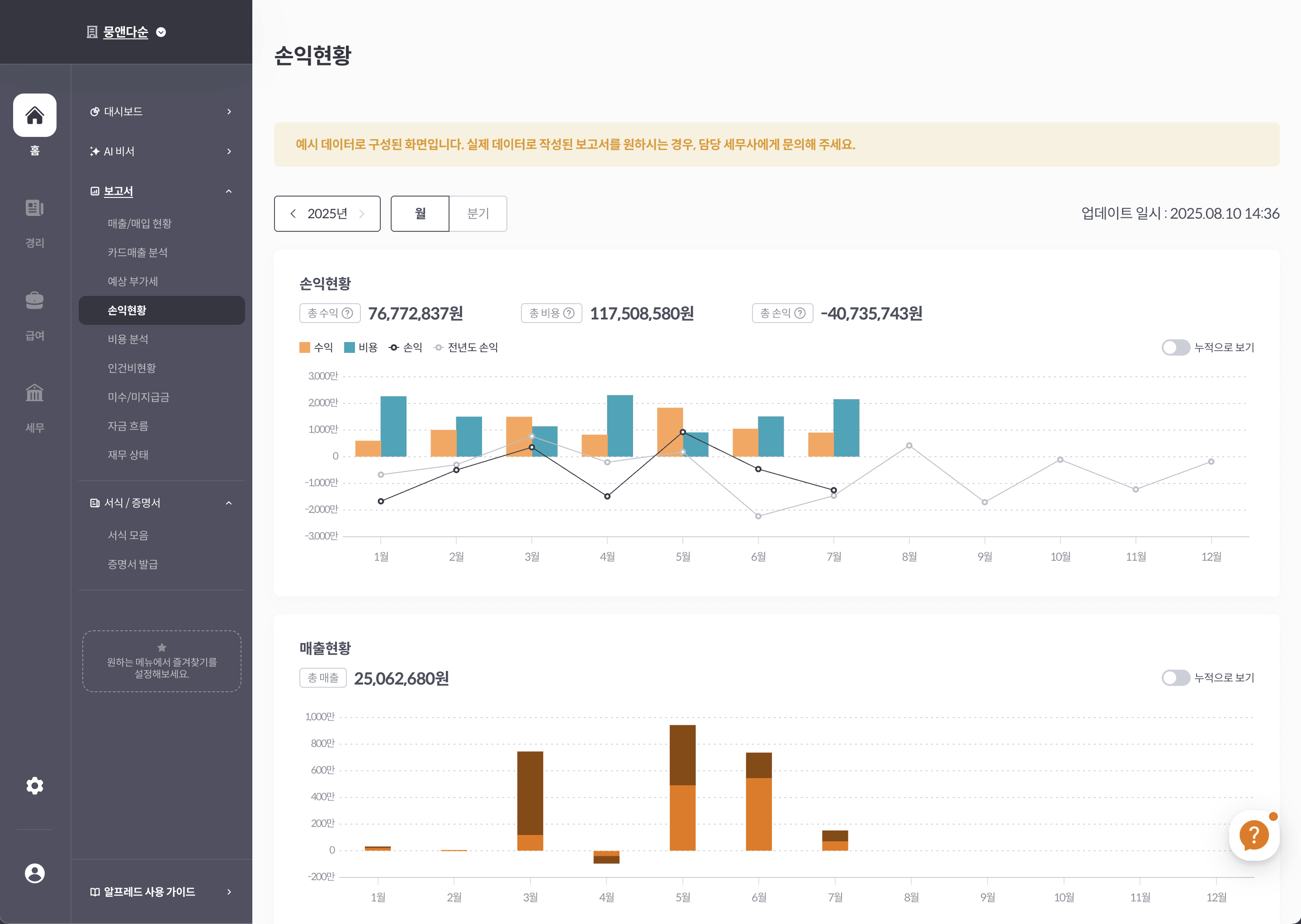 매입, 매출, 급여 등 간단하고 빠른 재무/세무 리포트를 제공하고 있습니다.